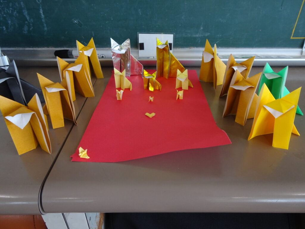 自主的に児童が折り、台座まで!これを見たクラスメイトも「すごい!」と笑顔に。