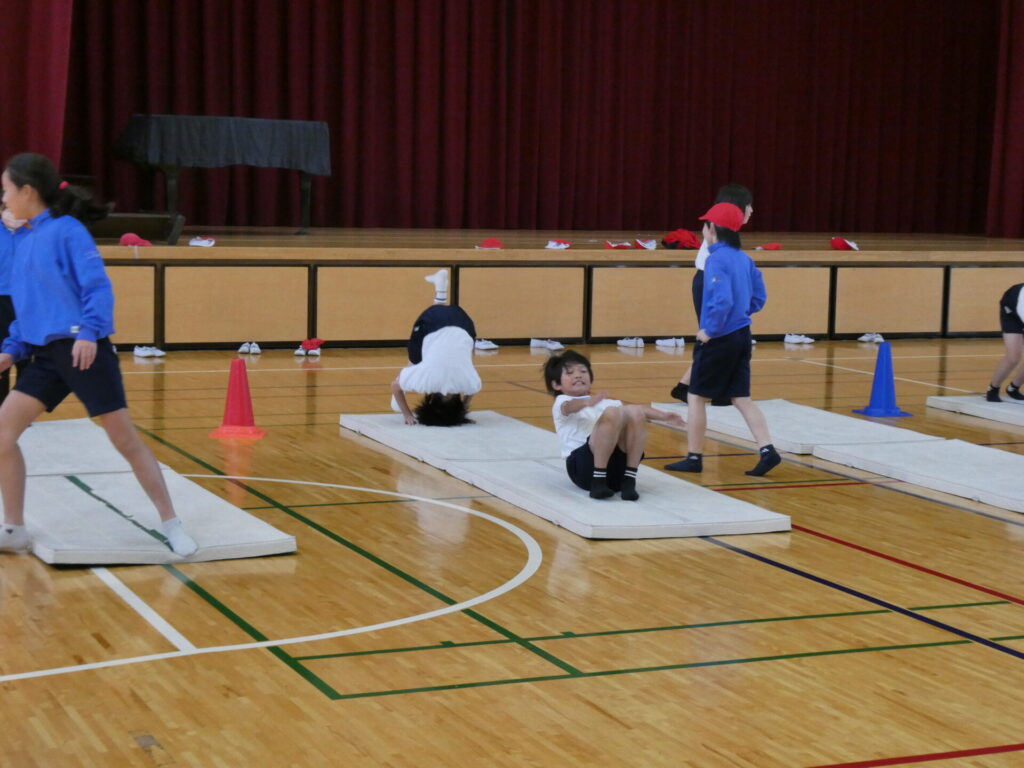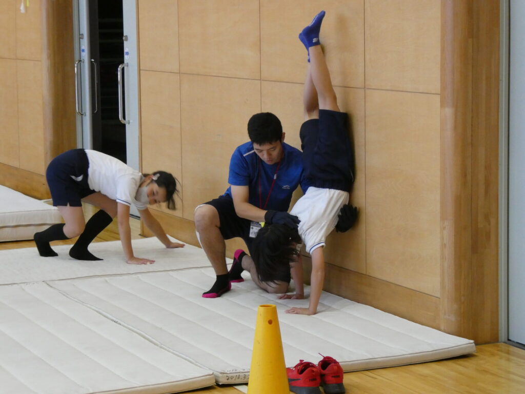 子供たちの成長はとても著しいもので、「後転が苦手」と手を挙げていた子たちは、大きなマット(エバーマット)を広げて伸膝後転で足が伸びているか何度も回って確認し、側転が苦手と言っていた子たちはロンダート(側転+体をひねる)に意気揚々と挑戦するように成長を遂げていました。