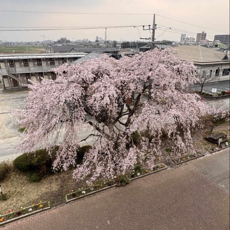 新堀小学校でも一本の枝垂れ桜が見ごろを迎えています。