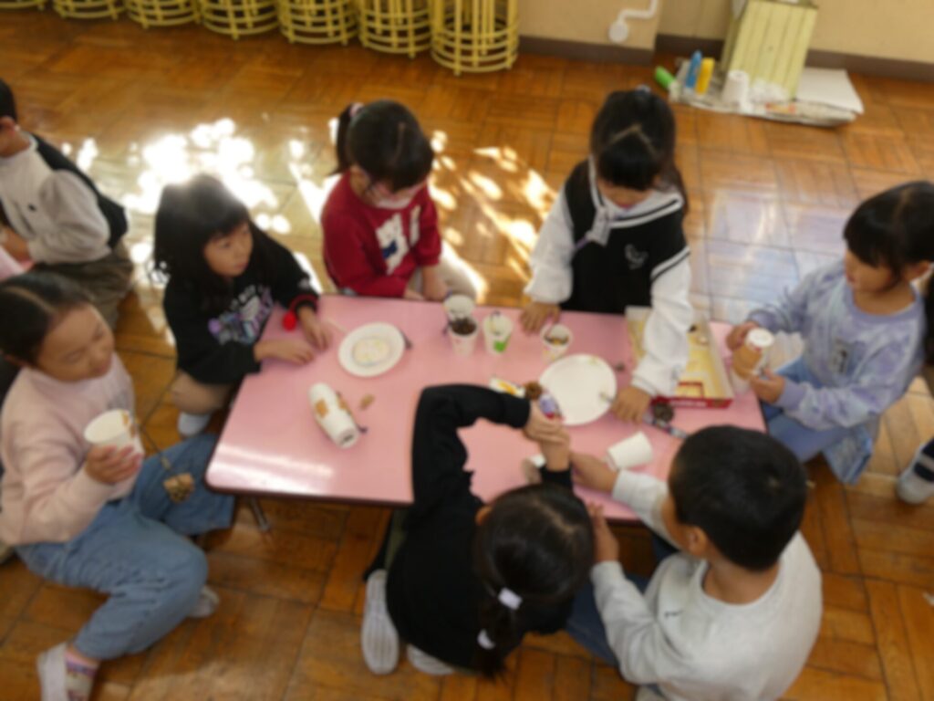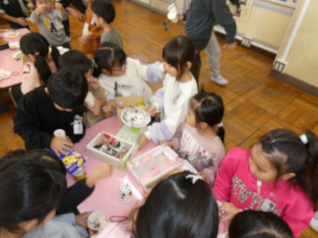 秋の素材を使ったオリジナルのおもちゃを持ち寄り、1・2組合同で遊びました。