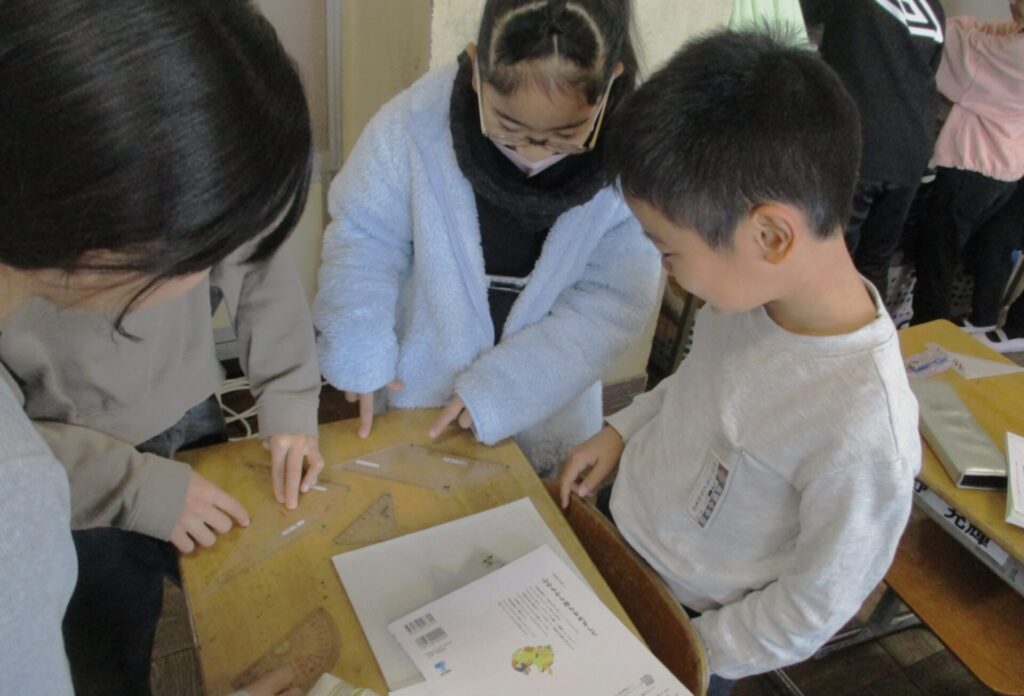 三角定規を使い、図形の書き方を自分たちで復習していました。