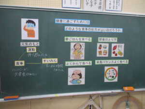 健康に過ごすためにはどのような食事の仕方が大切なのかについて授業をしていただきました。給食に出てくる食材をグループワークで栄養素別に並び替えをして、自分の生活を見直す良い機会となりました。